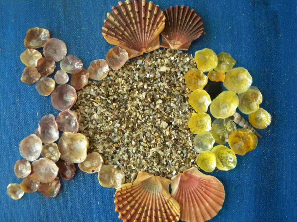Coquillages, galets, bois flottés, verre de Mer, tissus, laine, plumes, perles…